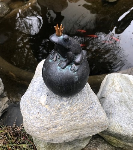 Froschkönig (Lat. Anura) handgefertigt aus reinem Kupfer (Altkupfer, ressourcenneutral und nachhaltig) ist auf einem kleinen Flussstein befestigt und schmückt den Gartenteich und Vogeltränke im Garten und auf Terrasse und Balkon.